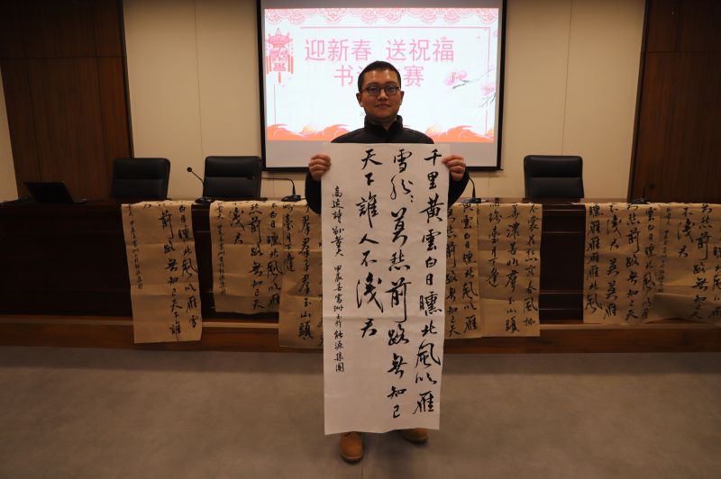 比賽期間,參賽選手們盡情揮毫潑墨,抒發(fā)著對(duì)書(shū)法的熱愛(ài)??瑫?shū)蒼勁有力,既有雄健的力度,又不失柔和之美;隸書(shū)古樸典雅,方正中透著嚴(yán)謹(jǐn),散發(fā)著渾厚而莊重的藝術(shù)氣息;行書(shū)如高山流水、瀟灑飄逸,不因時(shí)勢(shì)之變化而易其形,故能歷久彌新。比賽引來(lái)眾多同事駐足觀看,大家圍聚一起,一幅幅地欣賞著、回味著,對(duì)喜歡的作品更是贊不絕口......現(xiàn)場(chǎng)洋溢著迎新春的喜悅。最終經(jīng)過(guò)評(píng)委組綜合評(píng)定,吳霽洲同志榮獲本次書(shū)法比賽一等獎(jiǎng)。