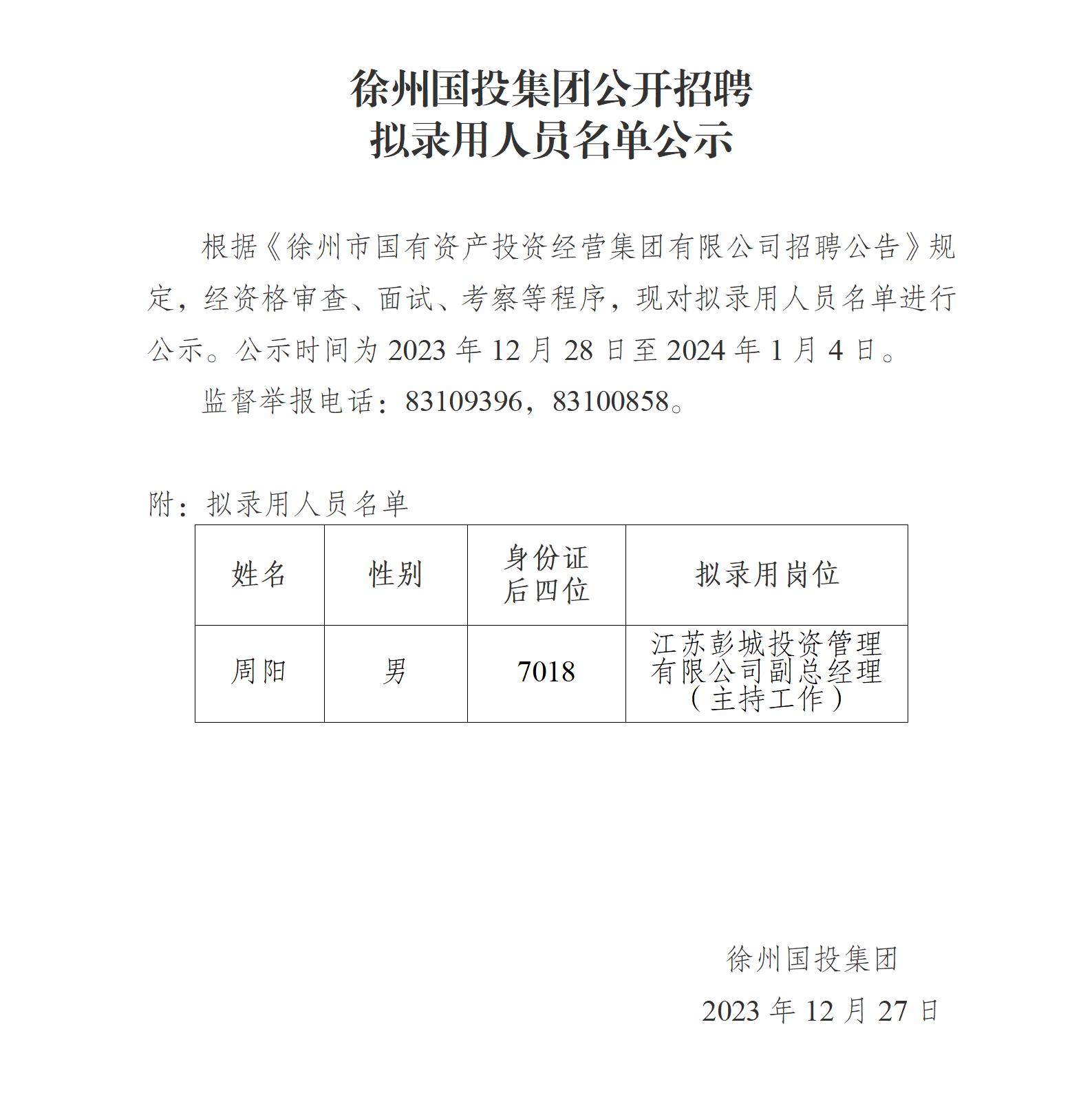 徐州國(guó)投集團(tuán)公開招聘擬錄用人員名單公示