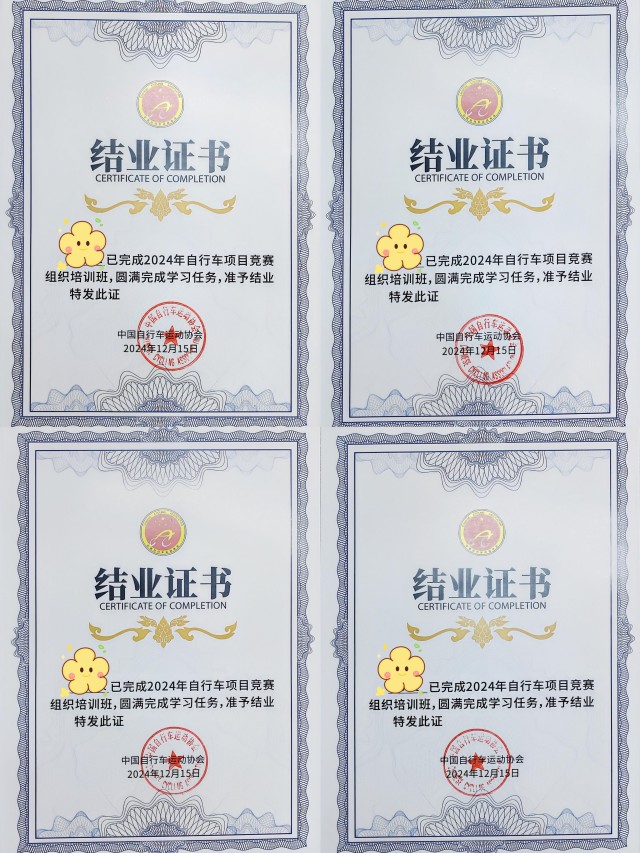 12月中旬,國(guó)體文化體育(徐州)有限公司(以下簡(jiǎn)稱“國(guó)體徐州”)經(jīng)過(guò)了嚴(yán)格的篩選與審核,選拔了4名競(jìng)賽組織管理人員參加了中國(guó)自行車運(yùn)動(dòng)協(xié)會(huì)組織的“2024年自行車項(xiàng)目競(jìng)賽組織培訓(xùn)”,并通過(guò)考核取得結(jié)業(yè)證書。